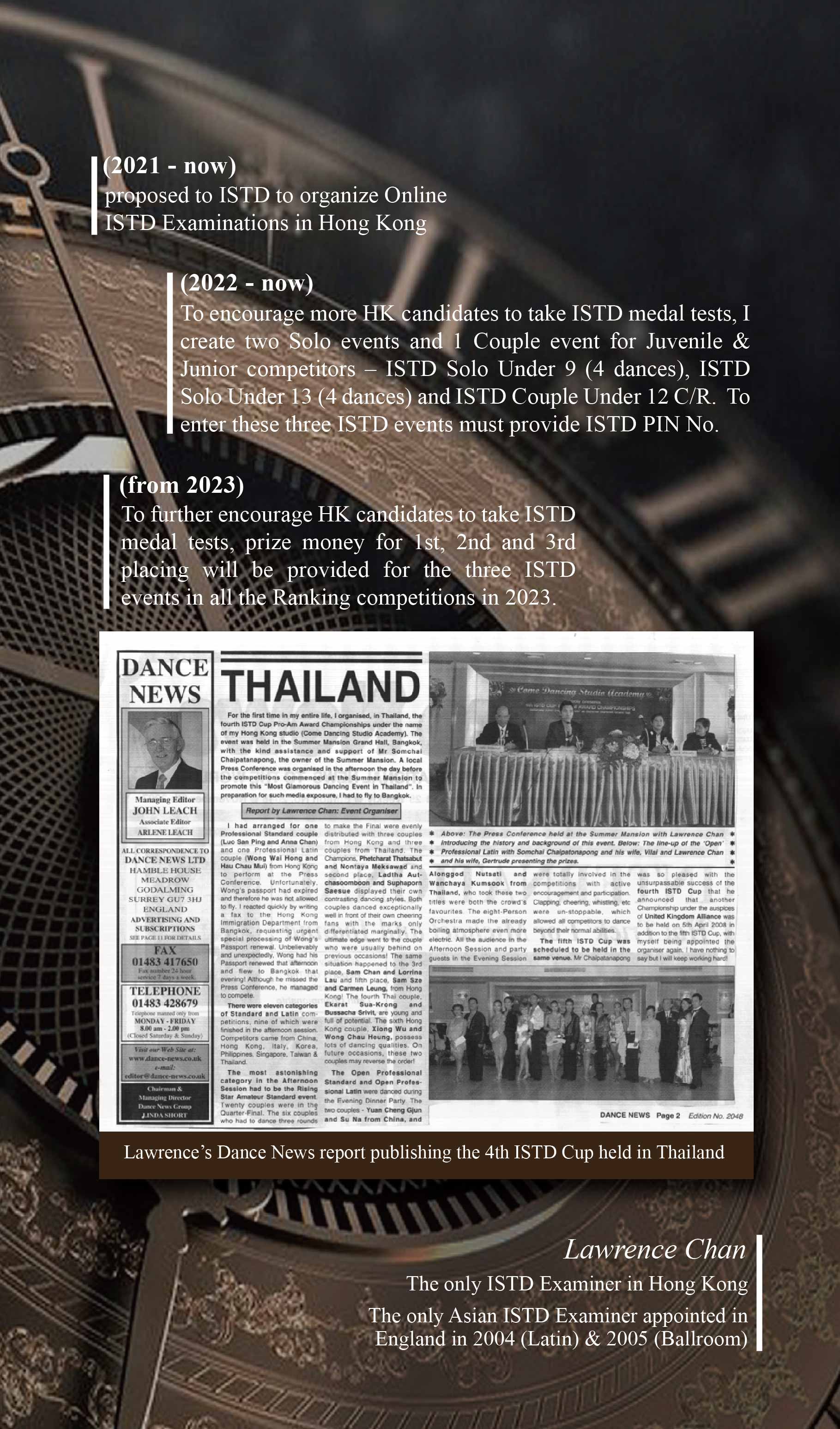 Lawrence : I have been doing the jobs of promoting DanceSport by the way of persuading swopping advertisements of Programme Magazines for overseas competitions and Hong Kong competitions over the past 10 years or so. I do not specifically aim for IDSF or WDC events!