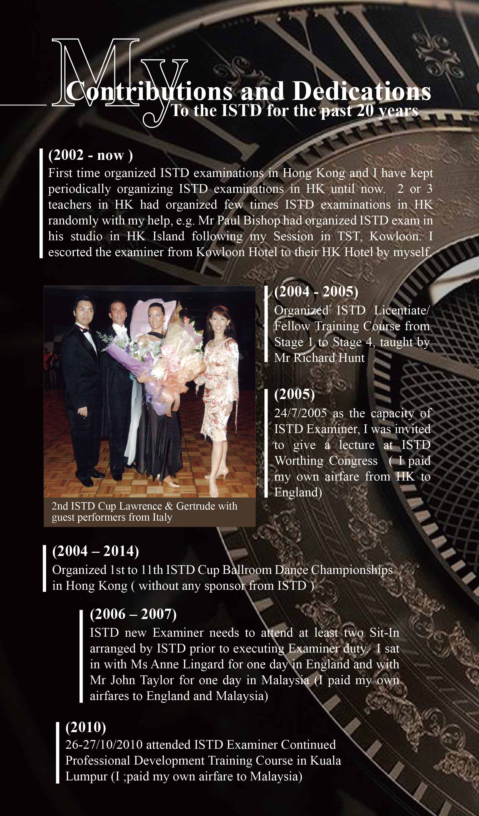 Lawrence : (a) On 14/12/03, Macau organized IDSF championships, they wanted to find a top couple to perform. I helped them to find Paul Green & Alexander Gisher and brought them to Macau personally at my own expense even though they did not invite me to judge! (b) On 17-18/7/04, I was invited to judge in Thailand by Sittichai Preyadara (over the phone). I purchased my air ticket together with one Open Amateur Latin couple. Later Sittichai called me again saying that he could not allow me to judge because I did not have IDSF Licence. I still went to support the IDSF event in Bangkok and brought the couple! (c) On 7/1/07 I had my knee operation 10 days before, I still accepted the invitation of HKDSA to adjudicate ; (d) On 13/1/08 (the day was fixed by my student), I helped my student to organize a competition in Tin Shui Wai , while on the same day, HKDSA organized their competition in Tai Kok Tusi, I took the initiative to co-operate with Mr George Yip to arrange the timing of both competitions so that the couples can have time to travel and take part in both events ; (e) On 9/3/08, My wife & I both attended (as normal guests only, not as judges) the event organized by HKDSA in the far end of the venue near HK Airport