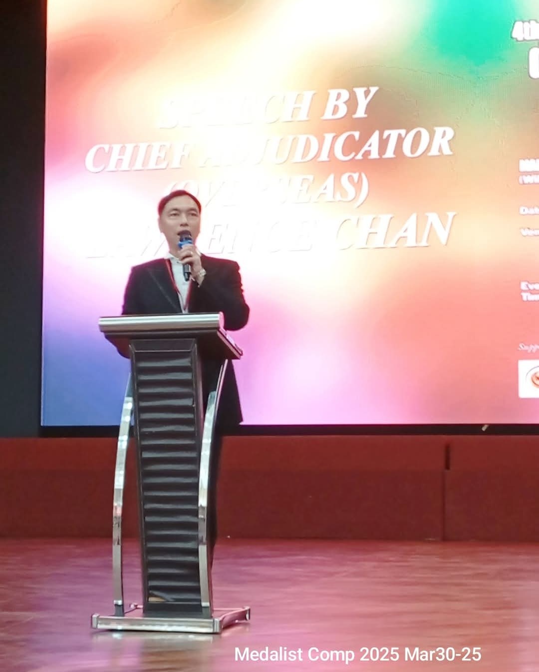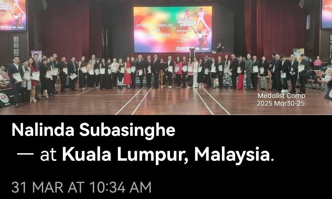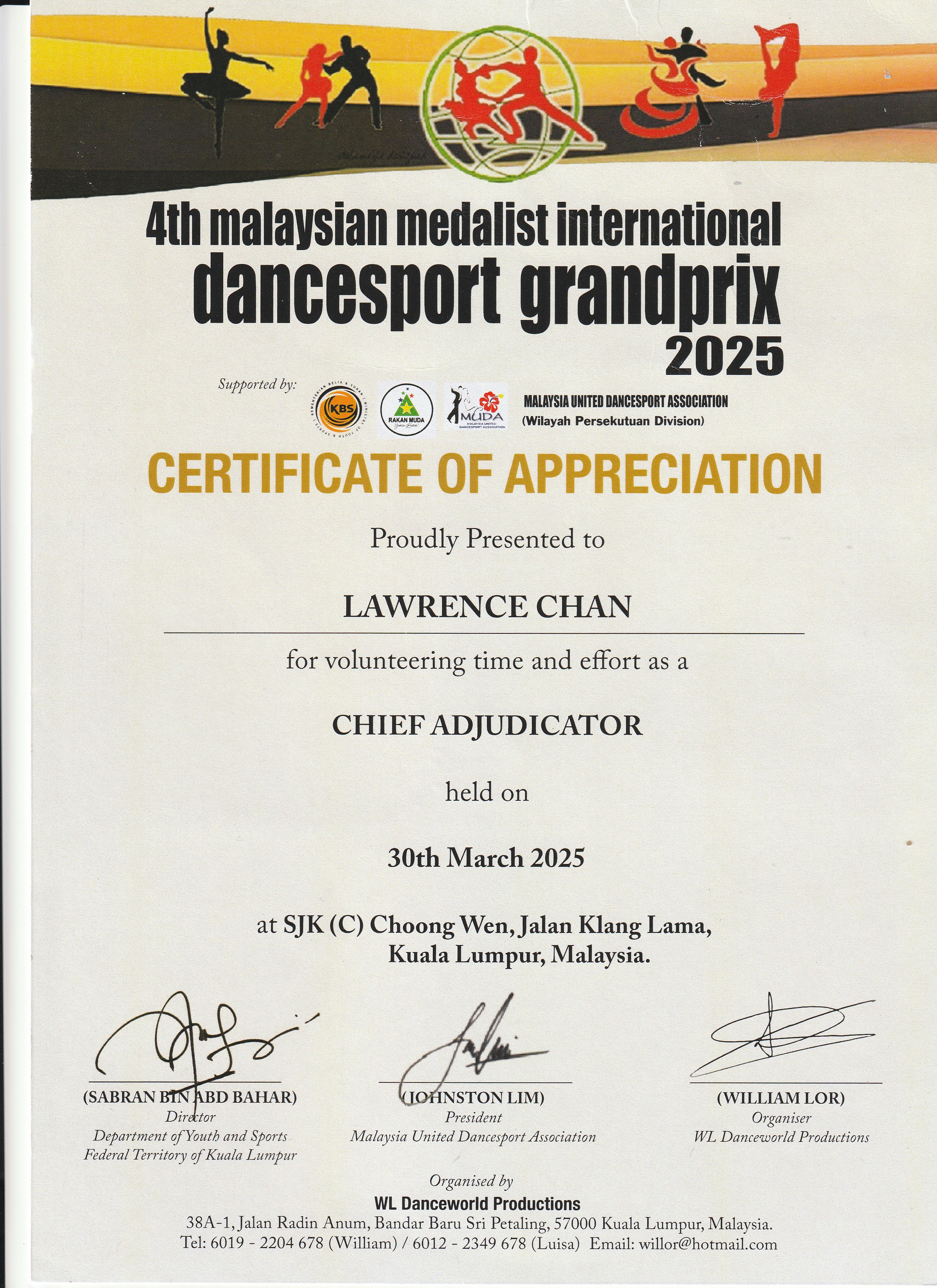 The most recent one was the 4th Malaysian Medalist International Dancesport Grandprix on 30/3/2025 in Kuala Lumpur, Malaysia. I am confident that my integrity, dance background, ability & knowledge cold uphold this mission. The organizer Mr William Lor who had known me for many years believed that I possessed all these assets and trusted on me to uphold the duty of Chief Adjudicator.